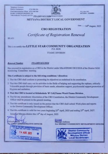 At the heart of Mityana, Uganda, Little Star Community Organisation shines a beacon of hope for children and families facing hardship. Our mission is to uplift and support the most vulnerable in our community, focusing on the well-being of children in need. Through comprehensive care, education, and empowerment programs, we are committed to nurturing their growth, ensuring a brighter, more secure future for every child and family we serve. Join us in our journey